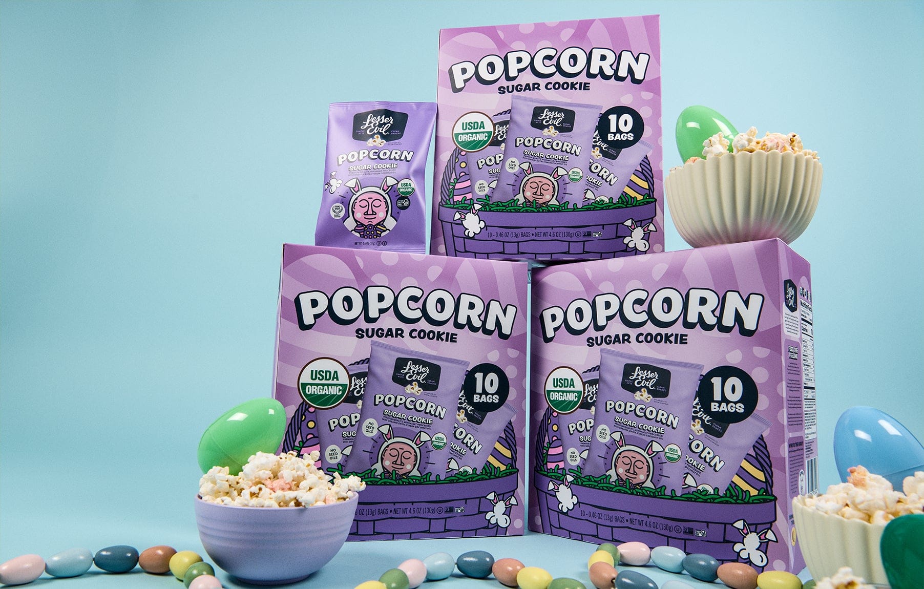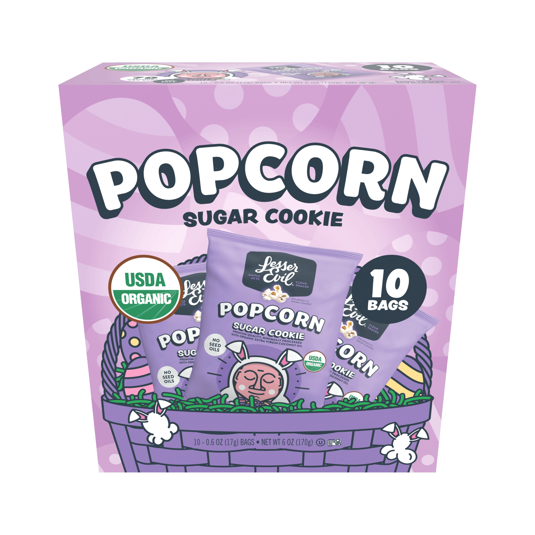 Everybunny loves a springtime snack. Lightly sweetened with just a sprinkle of cane sugar and air popped in better-for-you coconut oil, this Sugar Cookie popcorn is perfect for bunny-approved baskets, pastel-themed brunches, egg hunts, and every hoppy moment in between.